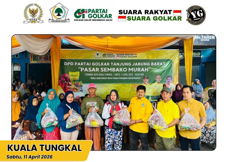 KUALA TUNGKAL, Wartajambi.id — Kepedulian terhadap kondisi ekonomi masyarakat kembali ditunjukkan Dewan Pimpinan Daerah (DPD) Partai Golkar Kabupaten Tanjung Jabung Barat (Tanjab Barat). Ketua DPD Partai Golkar Tanjab Barat Syufrayogi Syaiful, SiP, MH, menggelar Operasi Pasar Murah di Terminal Dalam Kota Kuala Tungkal, Sabtu (11/04/2026).
