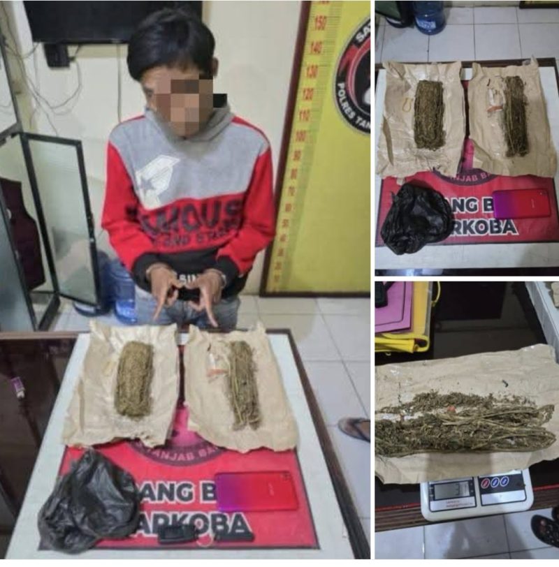 Dari tangan pelaku, aparat berhasil mengamankan sejumlah barang bukti, antara lain: 2 paket kertas cokelat berisi diduga ganja dengan berat masing-masing 74 gram bruto dan 31 gram bruto; 1 buah plastik warna hitam; 1 unit ponsel Vivo warna merah; 1 unit sepeda motor Honda Scoopy hijau dengan nomor polisi BH 4958 OW.