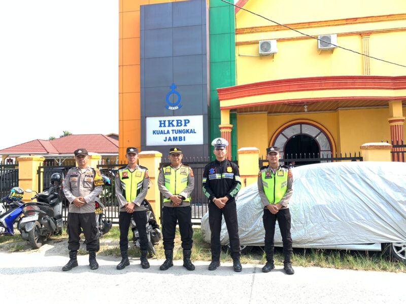 Kuala Tungkal, Wartajambi.id — Dalam upaya menjaga keamanan dan ketertiban masyarakat, personel Polres Tanjung Jabung Barat melaksanakan pengamanan ibadah Minggu di sejumlah gereja, salah satunya di Gereja HKBP yang berlokasi di Jalan Sisimangaraja RT 07, Kelurahan Tungkal Harapan, Minggu (20/7/2025).