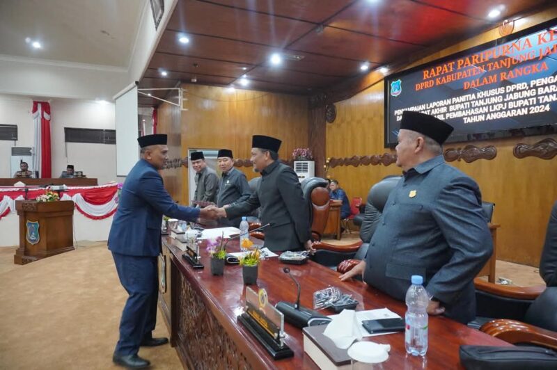 Kuala Tungkal, Wartajambi.id – Dewan Perwakilan Rakyat Daerah (DPRD) Kabupaten Tanjung Jabung Barat (Tanjab Barat), menggelar Rapat Paripurna dalam rangka Penyampaian Laporan Hasil Kerja Panitia Khusus (Pansus) DPRD, Pengambilan Keputusan DPRD, serta Penyampaian Pendapat Akhir Bupati terhadap Laporan Keterangan Pertanggungjawaban (LKPJ) Bupati Tahun Anggaran 2024, Senin (05/5/2025).